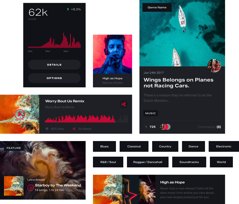 Holo Music is stuffed with various types of widgets, cards & components. Starting with a simple tag item, up to detailed stats cards for dashboards. Whatever you'll need: it's right there or will be introduced in the future update.